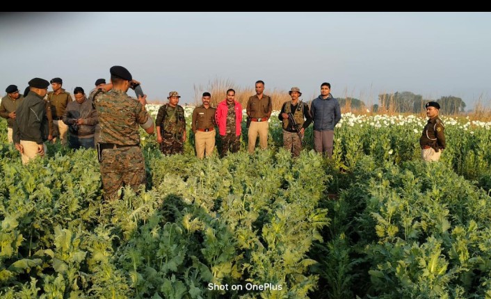 होते ही सोन नदी के दियरा इलाके में सोनडीला के पास बड़े पैमाने पर अवैध अफीम की खेती की जा रही है। सूचना की पुष्टि हेतु भौतिक सत्यापन कराया गया। इसके बाद इलाके की परिस्थिति को देखते हुए पुलिस अधीक्षक महोदया, पलामू के आदेशानुसार अनुमंडल पुलिस पदाधिकारी, हुसैनाबाद द्वारा पुलिस अधीक्षक, रोहतास से समन्वय स्थापित कर कार्रवाई की योजना बनाई गई। योजना सफल हुई पुलिस अधीक्षक, रोहतास के नेतृत्व में दिनांक 04/02/2025 को संयुक्त छापेमारी दल का गठन किया गया, जिसमें रोहतास पुलिस के साथ अनुमंडल पुलिस पदाधिकारी, हुसैनाबाद के निर्देशानुसार पलामू पुलिस भी शामिल रही।छापेमारी अभियान के दौरान लगभग 8 बीघा भूमि पर अवैध रूप से उगाई गई अफीम की खेती जब्त की गई, जिसका अनुमानित बाजार मूल्य 20 करोड़ रुपये आंका गया। एफएसएल टीम, रोहतास द्वारा आवश्यक साक्ष्य संकलन के बाद दंडाधिकारी की मौजूदगी में अफीम के पौधों को नष्ट किया गया। इस कार्रवाई में रोहतास पुलिस द्वारा अग्रतर विधि-सम्मत कार्रवाई जारी है। छापामारी दल: 1. अनुमंडल पुलिस पदाधिकारी, हुसैनाबाद, पलामू।