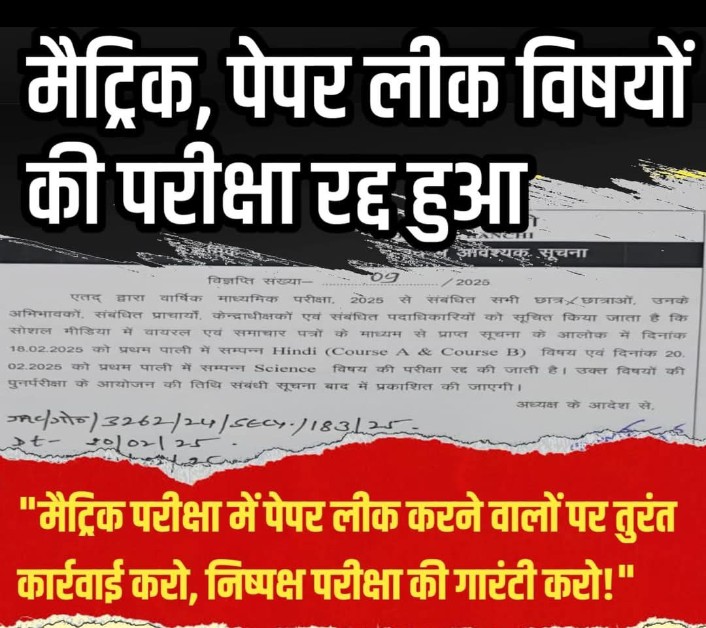 रांची:ऑल इंडिया स्टूडेंट्स एसोसिएशन (आइसा) झारखंड राज्य परिषद ने राज्य में मैट्रिक परीक्षा के प्रश्नपत्र लीक होने की घटना की कड़ी निंदा की है और इसे शिक्षा व्यवस्था की गंभीर विफलता करार दिया है। आइसा झारखंड के राज्य सचिव त्रिलोकीनाथ ने इस मामले में उच्च स्तरीय न्यायिक जांच की मांग करते हुए मुख्यमंत्री हेमंत सोरेन को तुरंत हस्तक्षेप करने की बात कही है। एवं दोषियों पर तत्काल करवाई करने की मांग की है। JAC अध्यक्ष भी अपनी जवाबदही लेते हुए पद से इस्तीफा देना चाहिए।त्रिलोकीनाथ ने कहा कि झारखंड की शिक्षा व्यवस्था लगातार भ्रष्टाचार और लापरवाही की शिकार हो रही है। छात्रों का भविष्य दांव पर लगा हुआ है और सरकार इसे रोकने में पूरी तरह विफल रही है। यह घटना न केवल परीक्षार्थियों के साथ अन्याय है, बल्कि राज्य की शिक्षा व्यवस्था पर एक गंभीर धब्बा भी है।प्रदेश संयुक्त सचिव संजना मेहता ने झारखंड सरकार पर प्रहार करते हुए कहा विधार्थियो के भविष्य के साथ खेलवाड बंद हो वही इस मामले में दोषियों की पहचान कर कठोर कार्रवाई की मांग की है और साथ ही परीक्षा प्रणाली में पारदर्शिता लाने के लिए ठोस कदम उठाने की अपील की है। संगठन के ओर से चेतावनी दी गयी है कि यदि जल्द से जल्द इस पर ठोस कार्रवाई नहीं की गई, तो पूरे राज्य में व्यापक छात्र आंदोलन किया जाएगा.आइसा झारखंड सरकार से मांग करता है कि— 1. पूरे मामले की उच्च स्तरीय न्यायिक जांच करवाई जाए.2. दोषी अधिकारियों और दोषी गिरोह के खिलाफ सख्त कानूनी कार्रवाई की जाए.3. छात्रों के भविष्य को सुरक्षित करने के लिए परीक्षा प्रणाली में सुधार किए जाएं।आइसा राज्य भर के छात्रों से अपील करता है कि वे इस मुद्दे पर एकजुट होकर संघर्ष करें और शिक्षा के अधिकार को सुरक्षित करने के लिए आवाज उठाएं।